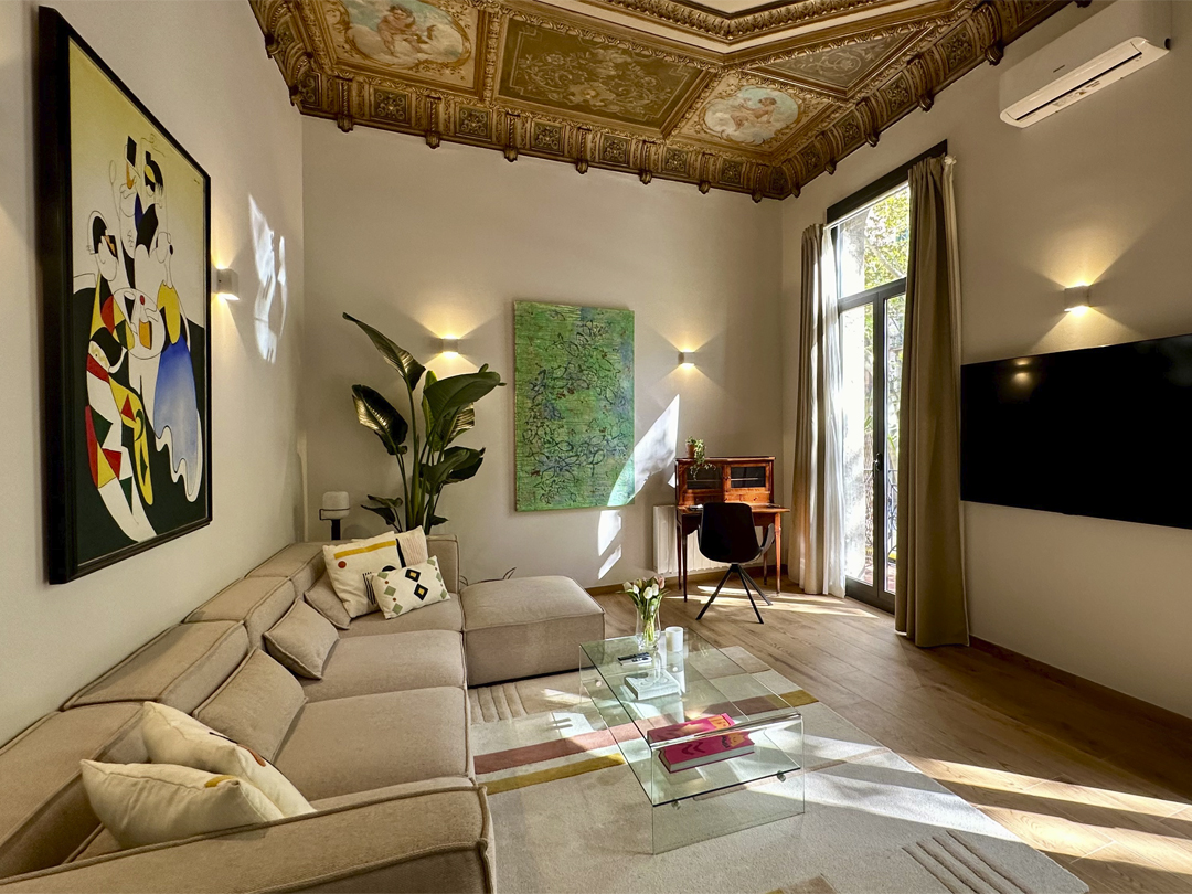 Junto al Corte Inglés de Plaza Cataluña se encuentra este excepcional y exclusivo apartamento de dos habitaciones, baño, cocina completa y un magnifico salón de más de 30m2 con techo alto y decorado con preciosos frescos pintado a mano.