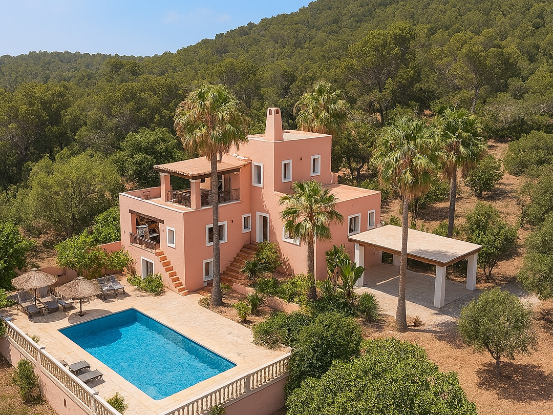 Villa Rosada se encuentra en las colinas de Es Cubells, y ofrece una ubicación privilegiada con vistas panorámicas a la isla de Formentera. La propiedad dispone de cuatro dormitorios, todos con baño en suite.